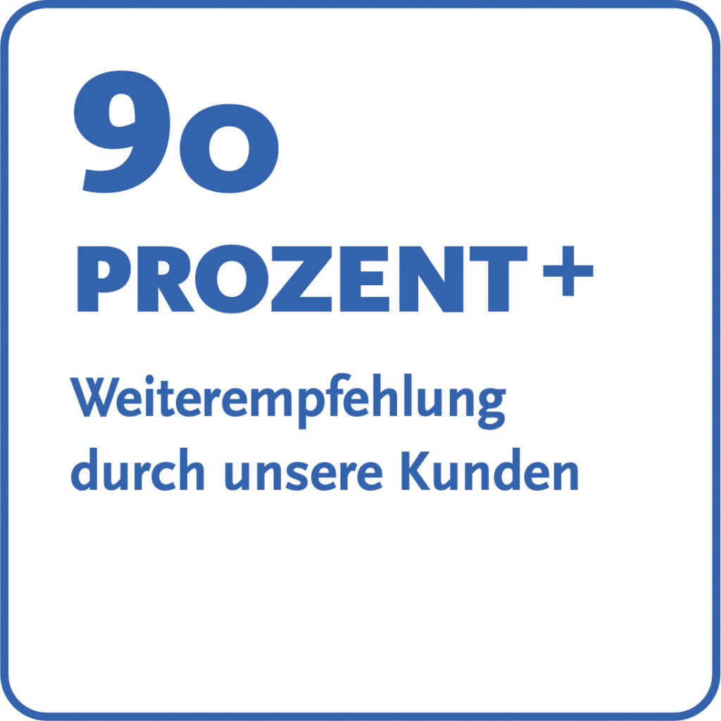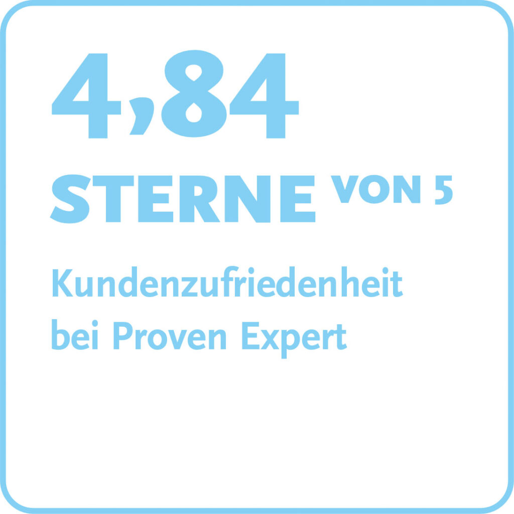 Seit unserer Gründung verzeichnen wir kontinuierliches Kundenwachstum und sind stolz darauf, eine hohe Kundenzufriedenheit mit einem Score von 4,84 von 5 Sternen sowie eine Weiterempfehlungsrate von über 90 % auf Proven Expert zu erreichen.